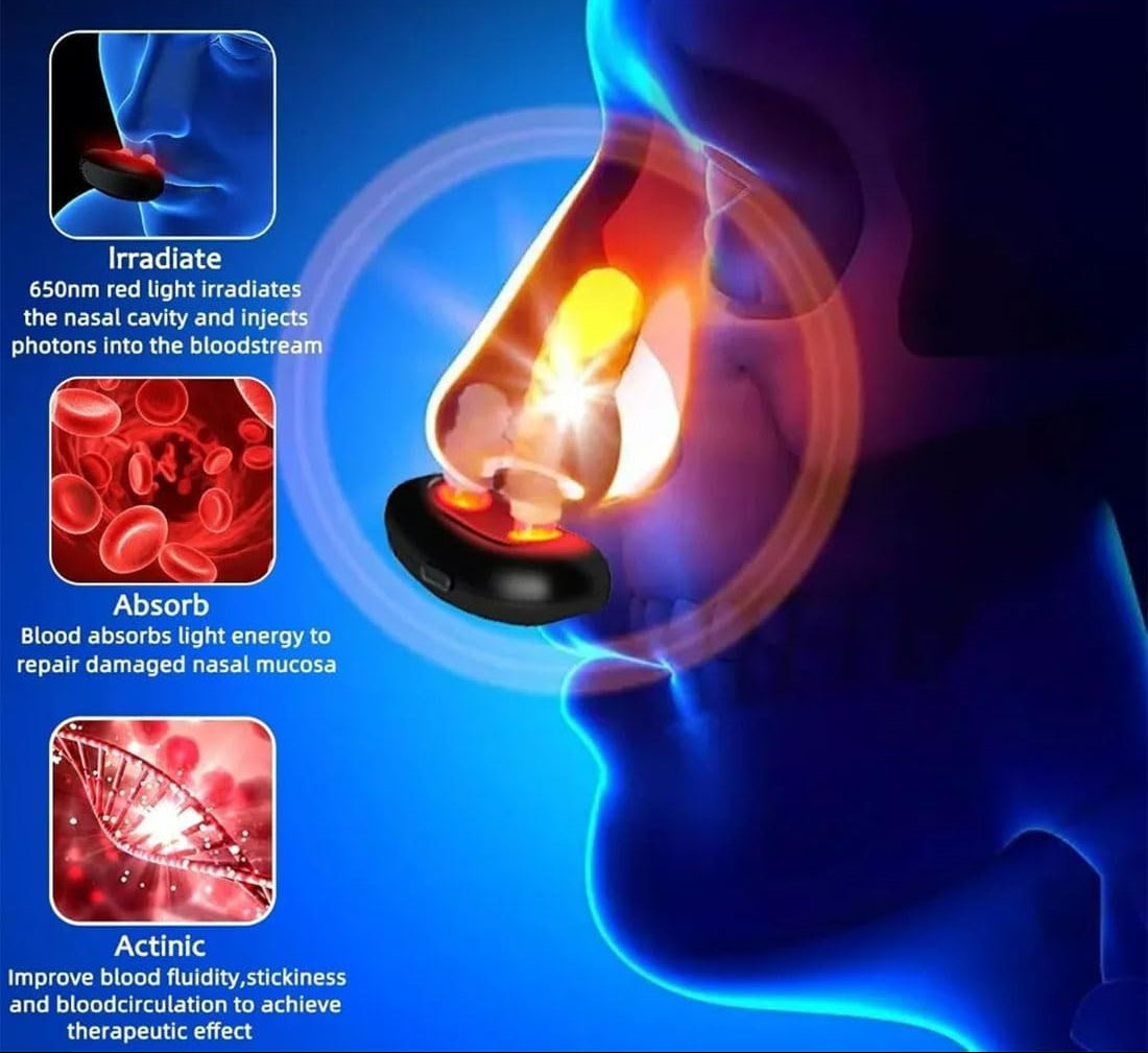 Red light therapy penetrates deep into nasal tissues to reduce inflammation, open airways, and relieve stuffiness, sneezing, and runny nose.